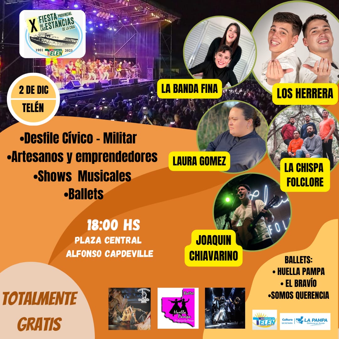En su Espacio de Arte continúa la muestra de alumnos del CREAr hasta marzo de 2024. El Museo de Historia Natural presenta su muestra permanente «Naturaleza y Cultura». En el Museo de Artes continúa el Salón de Artes del Fuego y la muestra “Memoria”, de Marta Arangoa en el Centro de Artes. Fiestas populares Ataliva Roca Viernes 1, sábado 2 y domingo 3 XIX edición de la Fiesta Provincial del Parque Luro Viernes 1: Participación del ballet municipal de Ataliva Roca. Actuación de Anita Ferreyra, Lucho Juárez, Laura Gómez Weizz, El Entrevero y el cierre a cargo de Carlos Ramón Fernández. Sábado 2: Participación del ballet municipal de Ataliva Roca. Actuación de Memi Magallanes, León Gamba, Los Jarillales, Serena Gamboa y el cierre a cargo del Indio Lucio Rojas. Domingo 3: Participación del ballet municipal de Ataliva Roca. Actuación de Matías Godoy, Rocío Bustamante, Generación y el cierre a cargo con Campedrinos. Entrada libre y gratuita para residentes del pueblo y para menores de 12 años. Winifreda Sábado 2 | 17:00 | Vivero Municipal «Ernesto Lucero» | Cruce Rutas Nacional 35 y Provincial 10. V Fiesta Provincial del Mate El evento contará con la presentación de los artistas pampeanos: «El Entrevero», grupo folclórico tradicional de Santa Rosa, «Poca Soda», banda que fusiona géneros populares y Laura Gómez Weizz, galardonada como solista vocal femenina en el 46º Festival Nacional de Música Popular Argentina en Baradero 2020. Además subirá al escenario el talentoso cantante Tyago Griffo, reconocido por su destacada trayectoria en la escena musical cuartera y cerrará la jornada la DJ de moda Flor Galiano. Feria de Artesanías, manualidades y patio de comidas. Telén Sábado 2 | 18:00 | Plaza Central Alfonso Capdeville | Entrada libre y gratuita. X° Fiesta Provincial de las Estancias de la Cría Se presentarán los ballets Huella Pampa, Bravío, Somos Querencia. Actuación de Joaquín Chiavarino, La Chispa Folclore, Laura Gómez Weizz, La Herrera y La Banda Fina. Aniversarios Villa Turística Casa de Piedra 17 aniversario. Fundación: 30 de noviembre de 2006 Viernes 1 diciembre a las 21:30 proyección del Cine Móvil con películas de cine nacional. Sábado 2 | Desde las 9 Se desarrollarán diversas actividades deportivas y culturales como regata de kayaks, fútbol infantil y bicicleteada. Presentación de stand up y artistas locales y regionales. Habrá feria de artesanos durante todo el día, puestos de comidas y un gran cierre de celebración con cena y baile. Santa Rosa Barrio Escondido 15 años de la Biblioteca Popular “Teresa Pérez” Sábado 9 diciembre | Desde las 19 | Gandhi 550. La Biblioteca Popular Teresa Pérez festeja sus 15 años con su tradicional fiesta en el predio del SUM del barrio. Además del gran baile popular al aire libre, se podrá disfrutar de espectáculos en vivo con la participación de artistas de diversas disciplinas. “Podremos disfrutar de la música, las muestras de fin de año de los talleres de la biblio, intervenciones, sorteos y como siempre, contaremos con un esmerado servicio de cantina con precios populares, con los famosos chori mariposas, tortas y el “alto guiso” con verduras de la huerta de la Biblioteca”. Museo Provincial de Historia Natural Acto apertura de la muestra permanente «Naturaleza y Cultura» Jueves 30 de noviembre | 11 horas| Quintana Nº 166. La muestra es el resultado de un proceso de trabajo sobre la conformación de las colecciones, los ejes temáticos y la trama humana. Sostenida en una nueva estrategia museográfica que combina diseño y comunicación visual integral con diferentes objetos y especímenes de las colecciones, la muestra relata el vínculo de los grupos humanos con la Naturaleza. Centro Cultural MEDASUR. Av. Belgrano Sur 180.