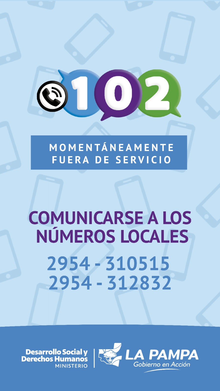 La Línea 102 se encuentra momentáneamente fuera de servicio en la Provincia. Está motivada en cuestiones operativas, por inconvenientes en los equipos informáticos en la central telefónica localizada en Buenos Aires, dependiente de la Subsecretaría de Políticas Sociales, del Ministerio de Capital Humano de la Nación.