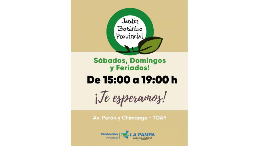 Desde la Dirección General de Recursos Naturales del Ministerio de la Producción se informó que a partir del primer fin de semana de agosto, el Jardín Botánico Provincial estará abierto los días sábados, domingos y feriados de 15:00 a 19:00, con fines recreativos. Para quienes no lo conocen todavía, este espacio natural está ubicado en Avenida Perón y Chimango de Toay, donde pueden asistir todas las familias, para conocer, disfrutar y de esta manera concientizar respecto de la conservación de la fauna y la flora del bosque de caldén. En el marco de los objetivos educativos que impulsa este museo al aire libre, ofrece los días de semana visitas guiadas interpretativas a diferentes instituciones escolares, para lo cual es necesarios inscribirse. A su vez a lo largo del año, en fechas programadas, y extendiéndose a las 20 hectáreas que lo conforman, se organizan encuentros de exploración de la naturaleza como avistaje de aves, Expo Vivero, etc.