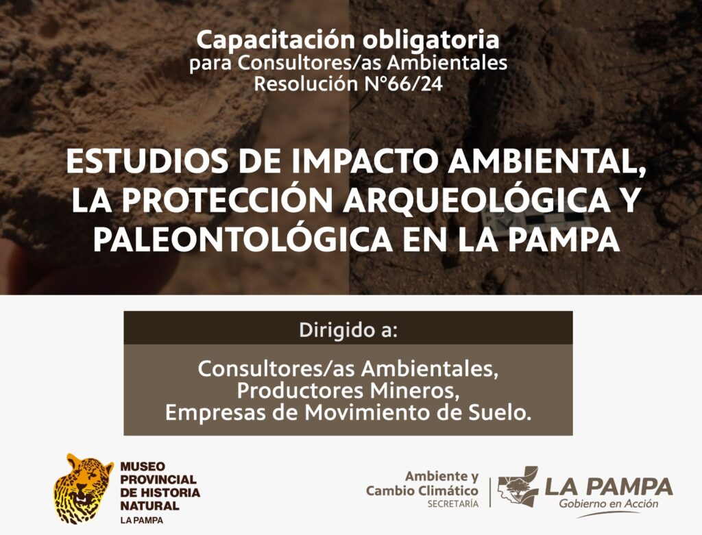 La Secretaría de Ambiente y Cambio Climático en conjunto con el Museo Provincial de Historia Natural, brindarán la capacitación: “Estudios de impacto ambiental y la protección arqueológica y paleontológica en La Pampa”.
