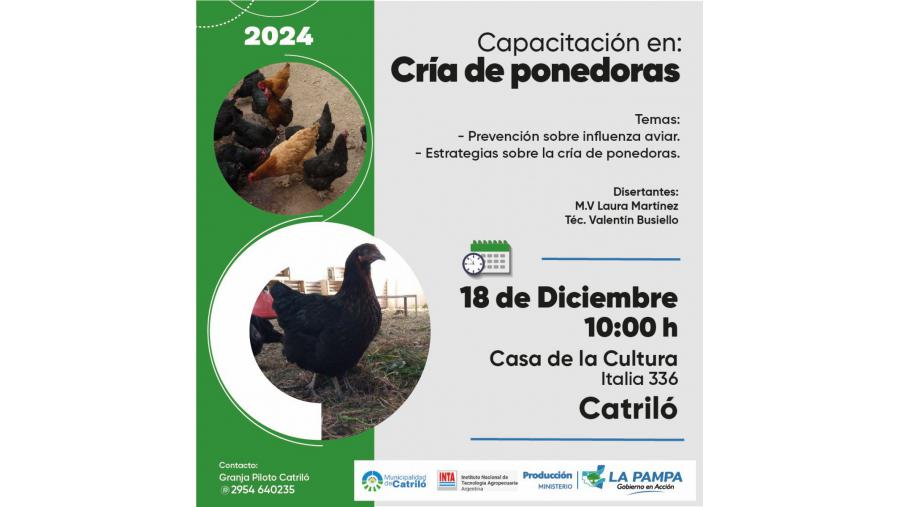 El Ministerio de la Producción a través de la Dirección de Ganadería, con el acompañamiento del municipio local, llevarán a cabo una capacitación sobre Cría de Ponedoras, que tendrá lugar el próximo 18 de diciembre desde las 10:00 en la sede de la Casa de la Cultura de Catriló. En dicha oportunidad se abordarán temas como “Prevención sobre Influenza Aviar” y “Estrategias sobre la Cría de Ponedoras”, los cuales estarán a cargo de la subdirectora de Producción Animal y Zoonosis, Laura Martínez y el técnico a cargo de la Granja Piloto del Ministerio en dicha localidad, Valentín Busiello. Este encuentro será el cierre de las entregas y actividades llevadas a cabo por este área a lo largo del 2024, a través de la producción llevada a cabo en la Granja Piloto, buscando acompañar la producción familiar de pequeños y medianos productores avícolas de toda la Provincia.