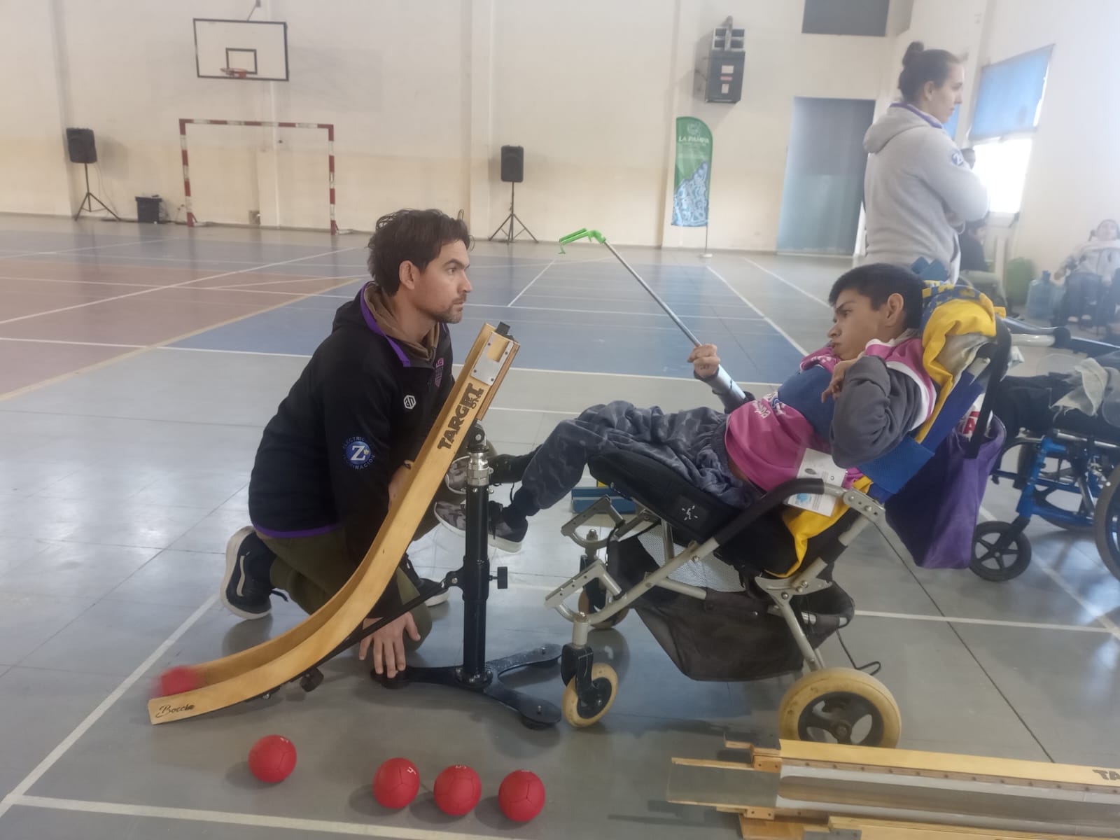 La boccia es una de las disciplinas que la practican personas en silla de ruedas con parálisis cerebral, lesión cerebral o discapacidad física severa. Cada competidor se coloca en uno de los extremos del campo, desde donde lanzan las bolas, algunos ulizando rampa de maderas, que son movidas por los asistentes que se ubican a espaldas del bochín y son guiados por el atleta.
