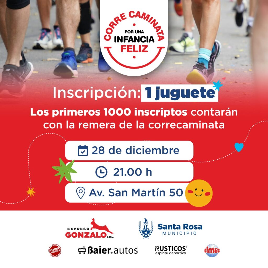 La Correcaminata Solidaria “Por una Infancia Feliz” organizada por la Municipalidad de Santa Rosa, con el acompañamiento de Expreso Gonzalo como auspiciante y el aporte de Cimes, Kirilan Deportes, Rústicos Espíritu Deportivo, Automotores Baier, Center Muebles y Cienfuegos, se realizará este 28 de diciembre a las 21 horas, en un recorrido de 5 km pensado para toda la familia.