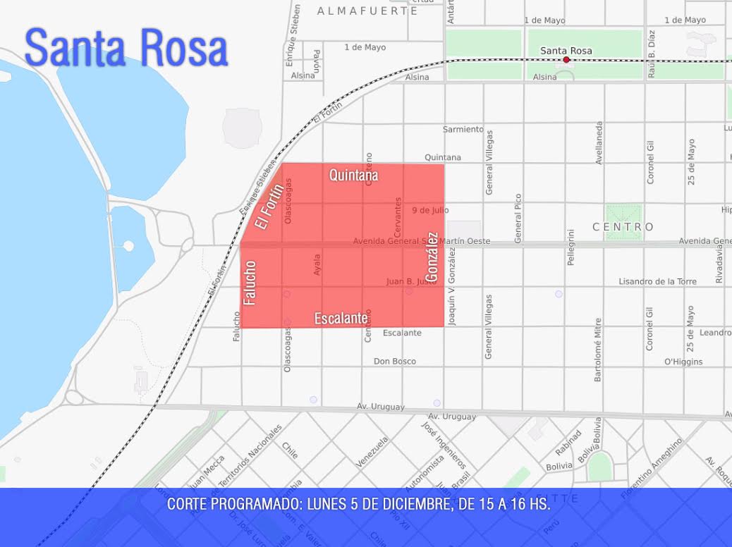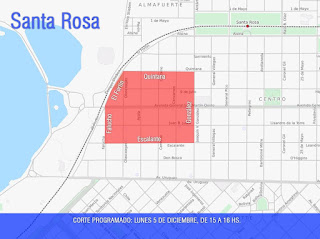 La CPE informa que el lunes 5, entre las 15 y las 16 horas se producirá un corte programado de energía enla zona céntrica de Santa Rosa delimitada por las calles González, Escalante, Falucho, El Fortín y Quintana. Durante ese lapso se realizarán tareas de mantenimiento en la subestación transformadora de la zona.