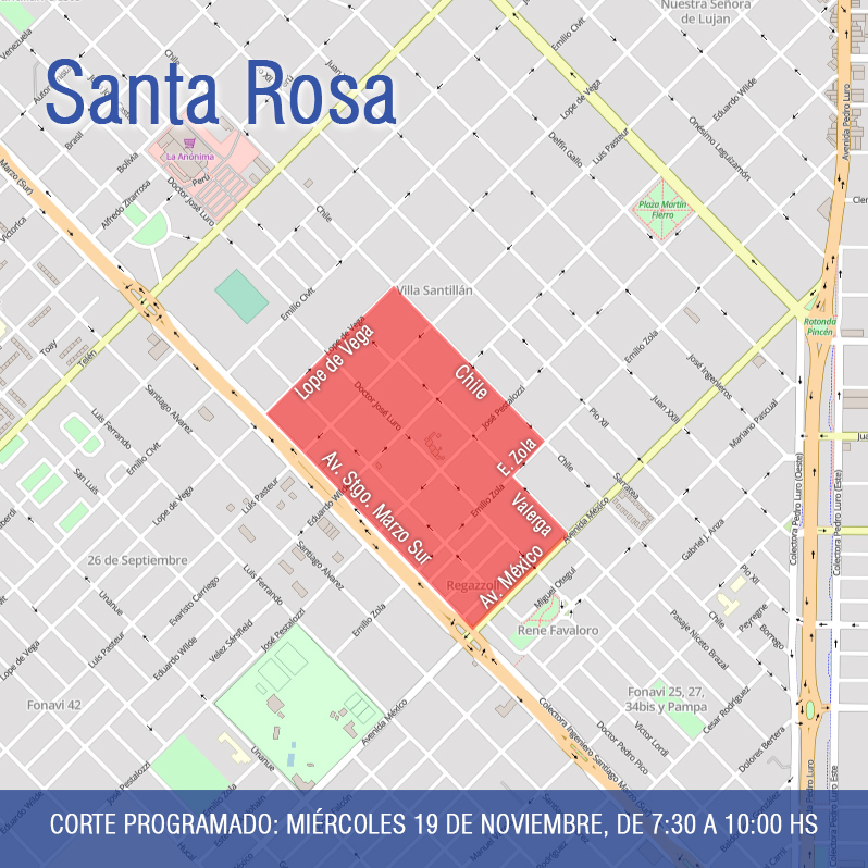 Este miércoles 19 de noviembre, desde las 7:30 hasta las 10:00 horas, se interrumpirá el servicio eléctrico en la zona comprendida por las calles Chile, Emilio Zola, Valerga, México, avenida Santiago Marzo Sur y Lope de Vega, de los barrios Villa Santillán y Regazzoli.