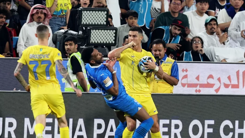 El momento de tensión ocurrió a los 41 minutos del segundo tiempo, cuando el marcador estaba 2 a 0 en contra del equipo de Ronaldo. En una disputa por un balón en mitad de cancha, Cristiano se cruzó con el brasileño Renan Lodi, del Al Hilal.