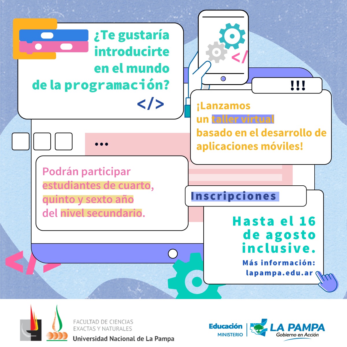 El Ministerio de Educación de La Pampa informó que desde hoy y hasta el 16 de agosto inclusive, se encontrará abierta la inscripción de estudiantes de cuarto, quinto y sexto año del nivel Secundario interesados e interesadas en formar parte de un taller virtual basado en el desarrollo de aplicaciones móviles.