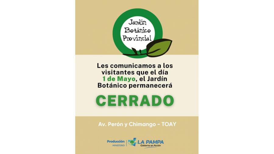 El Ministerio de la Producción, a través de la Dirección General de Recursos Naturales, informó a la comunidad y a los visitantes en particular que el próximo viernes 1° de Mayo, con motivo del feriado nacional por el Día de los y las Trabajadoras, las instalaciones del Jardín Botánico Provincial, permanecerán cerradas al público.
