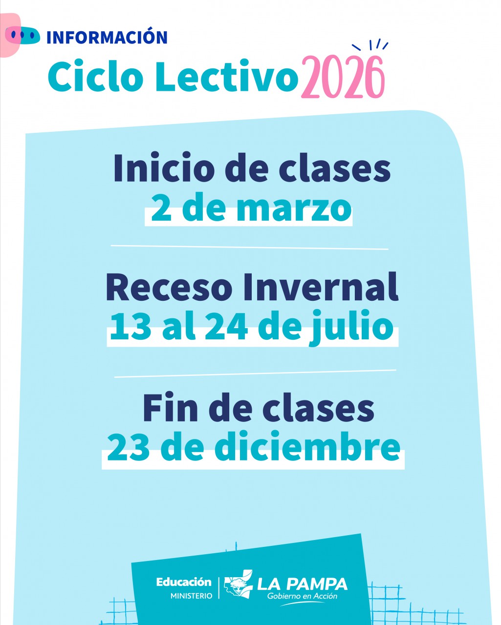Las clases para los niveles obligatorios iniciarán el 2 de marzo de 2026; mientras que el receso invernal se desarrollará entre los días 13 y 24 de julio inclusive. Por último, la finalización de clases está prevista para el día 23 de diciembre.
