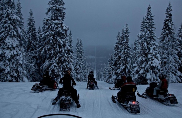 Motos de nieve encaran el camino entre árboles que forman la