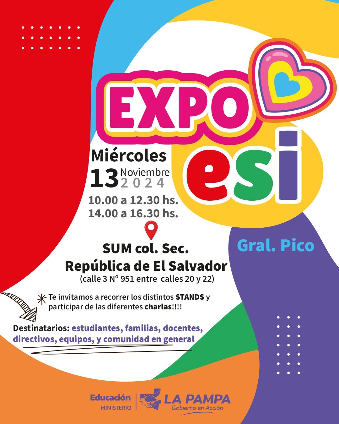 La Expo de Educación Sexual Integral 2024, impulsada por el Ministerio de Educación de La Pampa, se realizará este miércoles 13 de noviembre en el SUM del Colegio Secundario “República de El Salvador” (Calle 3 N° 951 entre calles 20 y 22) de General Pico.