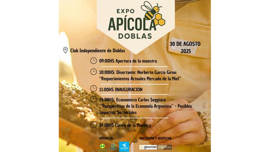 Este sábado 30 de agosto la localidad de Doblas será sede de la 28° Expo Apícola Doblas, que como todos los años es organizada por la Cooperativa de Servicios de Doblas (COSEDO), con el acompañamiento del Municipio local y del Ministerio de la Producción. El evento abrirá sus puertas en la sede del Club Independiente a partir de las 9:00, una hora después se sumará la disertación de Norberto Garcia Girou sobre ”Requerimientos actuales mercados de la miel”; luego el acto de inaugural desde las 14:00 y la presentación del Economista Carlos Seggiaro con “Perspectivas de la economía argentina”, Posibles Impactos Sectoriales. La exposición tiene como fin incorporarle a los productores un ámbito de intercambio de conocimientos, de experiencias, de traerles nuevas tecnologías y con ese objetivo, participan todas las instituciones del pueblo.