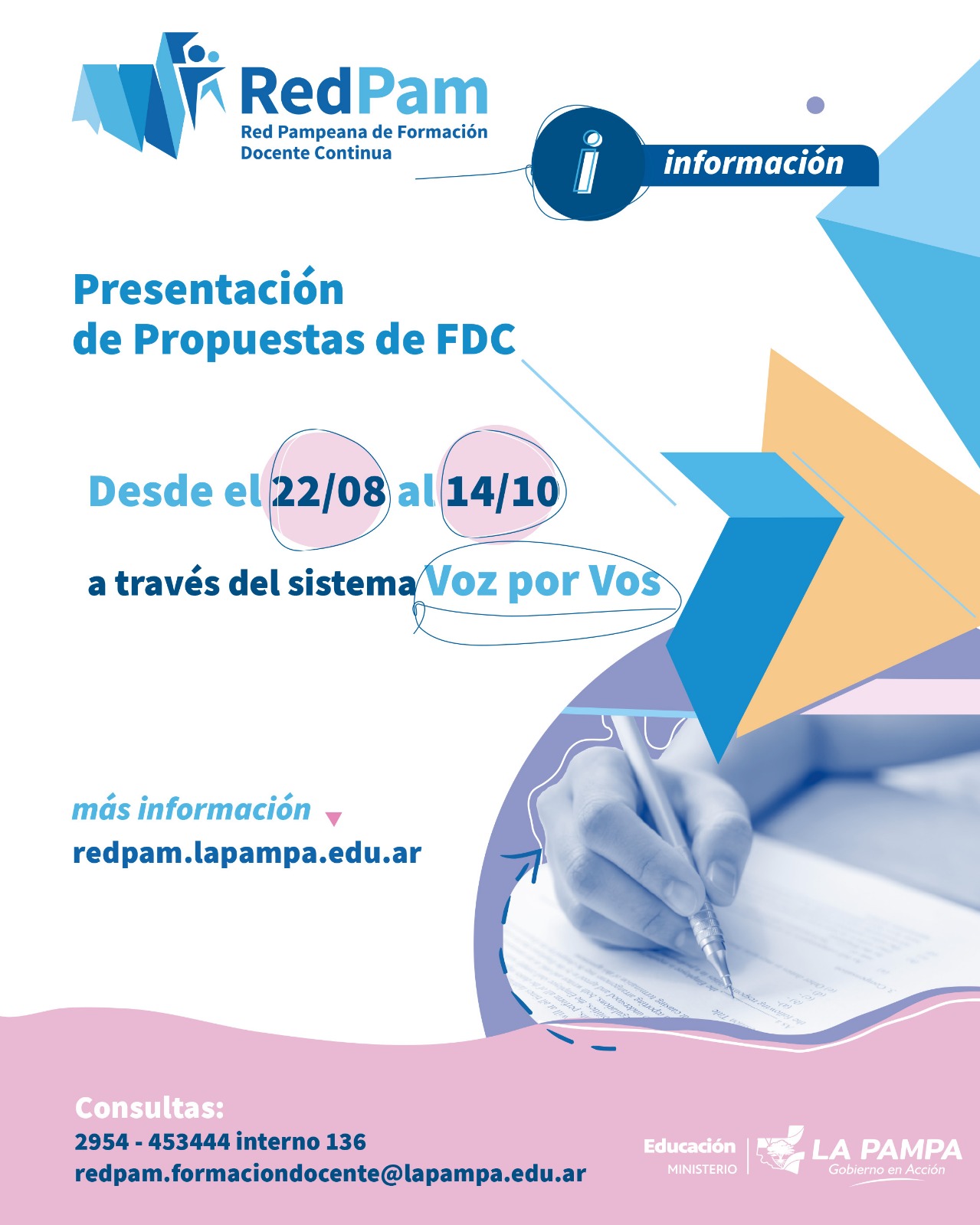 Desde el 22 de agosto al 14 de octubre inclusive, aquellas instituciones, organismos y dependencias registradas como oferentes de la Red Pampeana de Formación Docente Continua podrán acceder al sistema informático Voz por Vos y presentar propuestas formativas a implementar en el primer semestre del Ciclo Lectivo 2025.