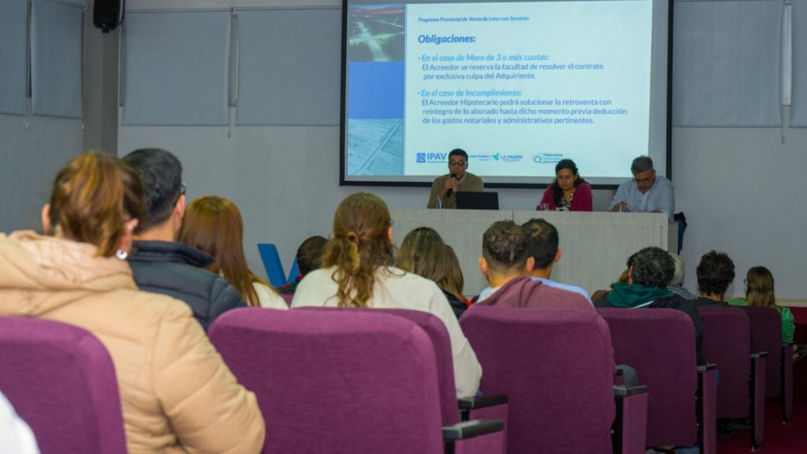 El IPAV realizó, en el SUM Tribunal de Cuentas de la Provincia, una charla informativa para las personas que son adjudicatarias del programa «Lote propio», que brinda una solución habitacional a familias pampeanas. En los terrenos ya se finalizaron las obras de energía eléctrica y alumbrado público y se encuentran avanzadas las ejecuciones de las obras de gas, agua y cloacas.