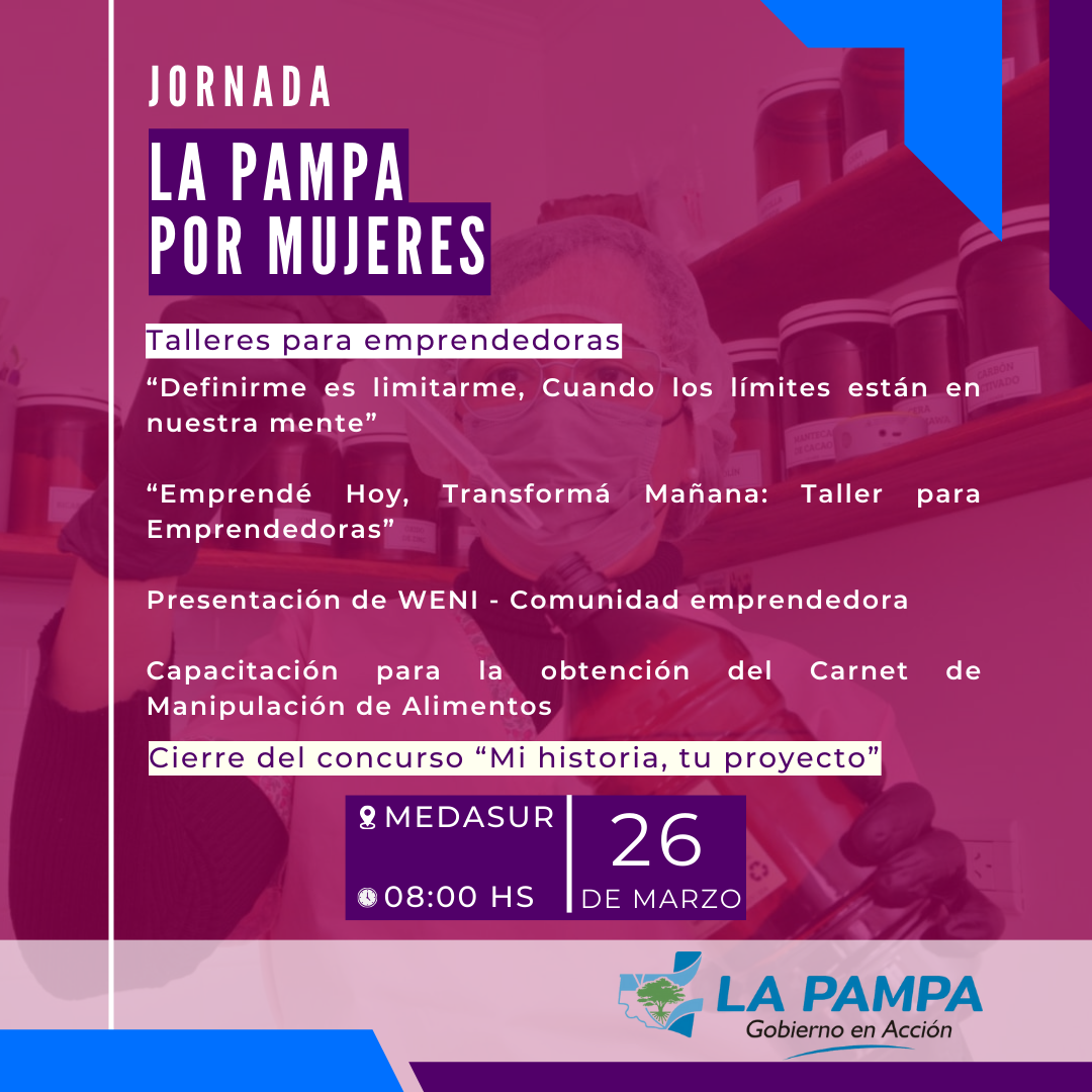 La Secretaría de la Mujer, Géneros y Diversidad, el Ministerio de la Producción y Dafas invitaron a participar de la jornada de capacitación “La Pampa por mujeres” organizada en colaboración con el Ministerio de Desarrollo Social y Derechos Humanos, la Secretaría de Trabajo y Promoción del Empleo y el Ministerio de Salud. La misma está destinada a emprendedoras.