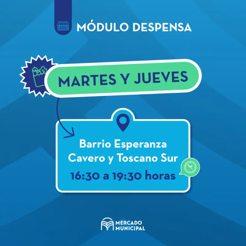 Como cada jueves, de 16:30 a 19:30 horas, el Módulo Despensa, ubicado en Cavero y Toscano Sur en el Barrio Esperanza, abrirá sus puertas con una propuesta accesible y de calidad para vecinas y vecinos.