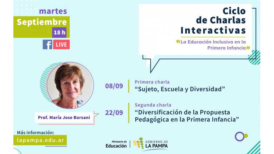 Las charlas “Sujeto, Escuela y Diversidad” y “Diversificación de la propuesta pedagógica en la primera infancia”, estarán a cargo de la especialista María José Borsani y se llevarán a cabo a través de la página en Facebook del Ministerio de Educación de La Pampa, los días 8 y 22 de septiembre a las 18, respectivamente.