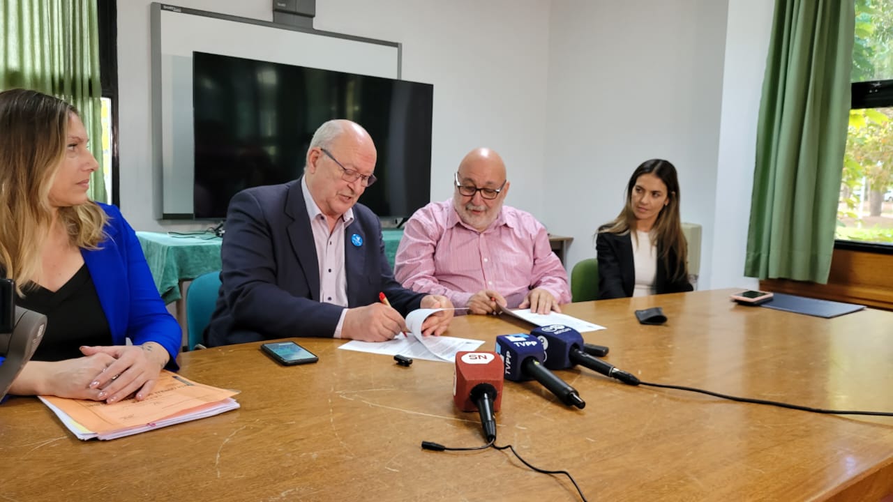 El secretario de Recursos Hídricos, Néstor Lastiri, y el decano de la Facultad de Ciencias Veterinarias de la Universidad Nacional de La Pampa, Abelardo Ferrán, en calidad de presidente del Laboratorio de Calidad de Alimentos Pampeanos (LabCAP), suscribieron hoy un convenio de colaboración mutua por el cual el laboratorio realizará análisis de muestras de agua de distintos orígenes.