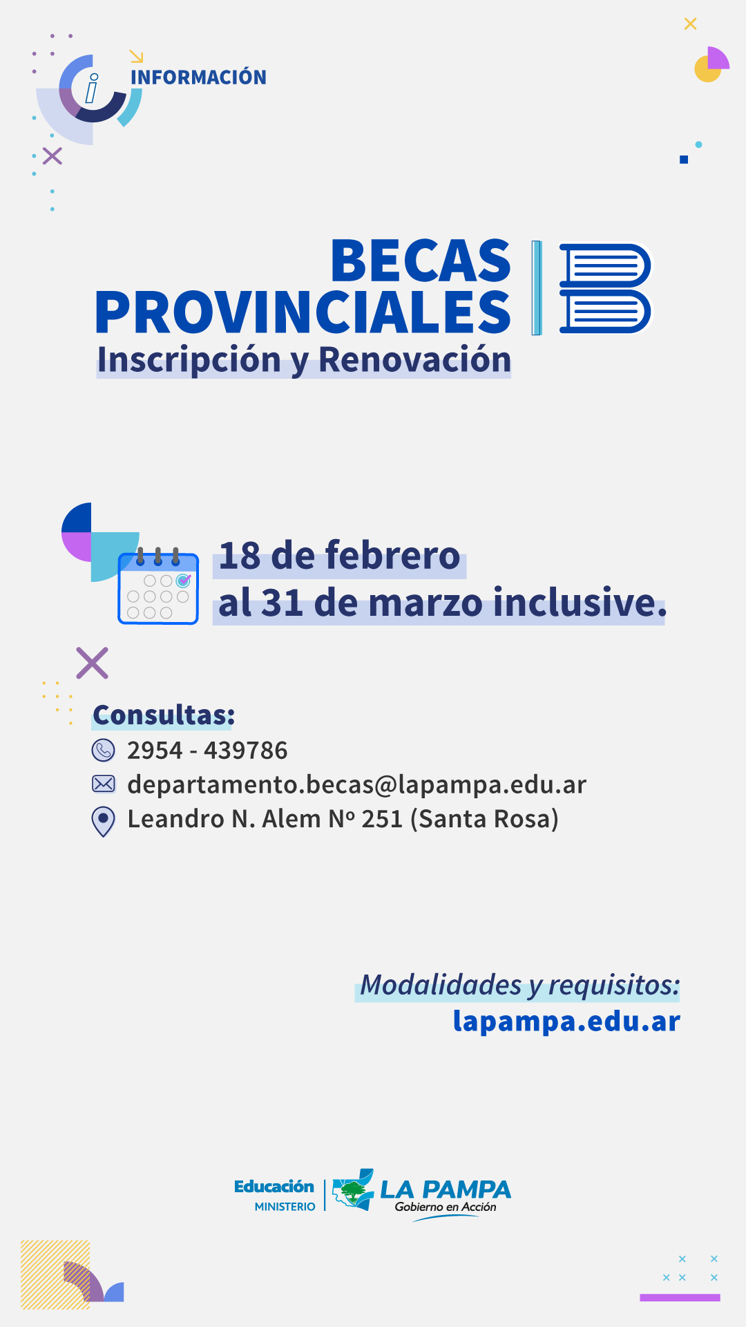 Para obtener mayor información respecto a las modalidades y requisitos, se podrá ingresar al sitio web del Ministerio de Educación de La Pampa: https://sitio.lapampa.edu.ar/index.php/estudiantes-familia/inclusion-social/becas-provinciales .