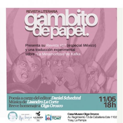 Por otra parte, el sábado 11 a las 18:00, en la misma Sala se presentará la la Revista Literaria “Gambito de papel” Nro. 17 y una traducción experimental de «La metamorfosis» de Franz Kafka.