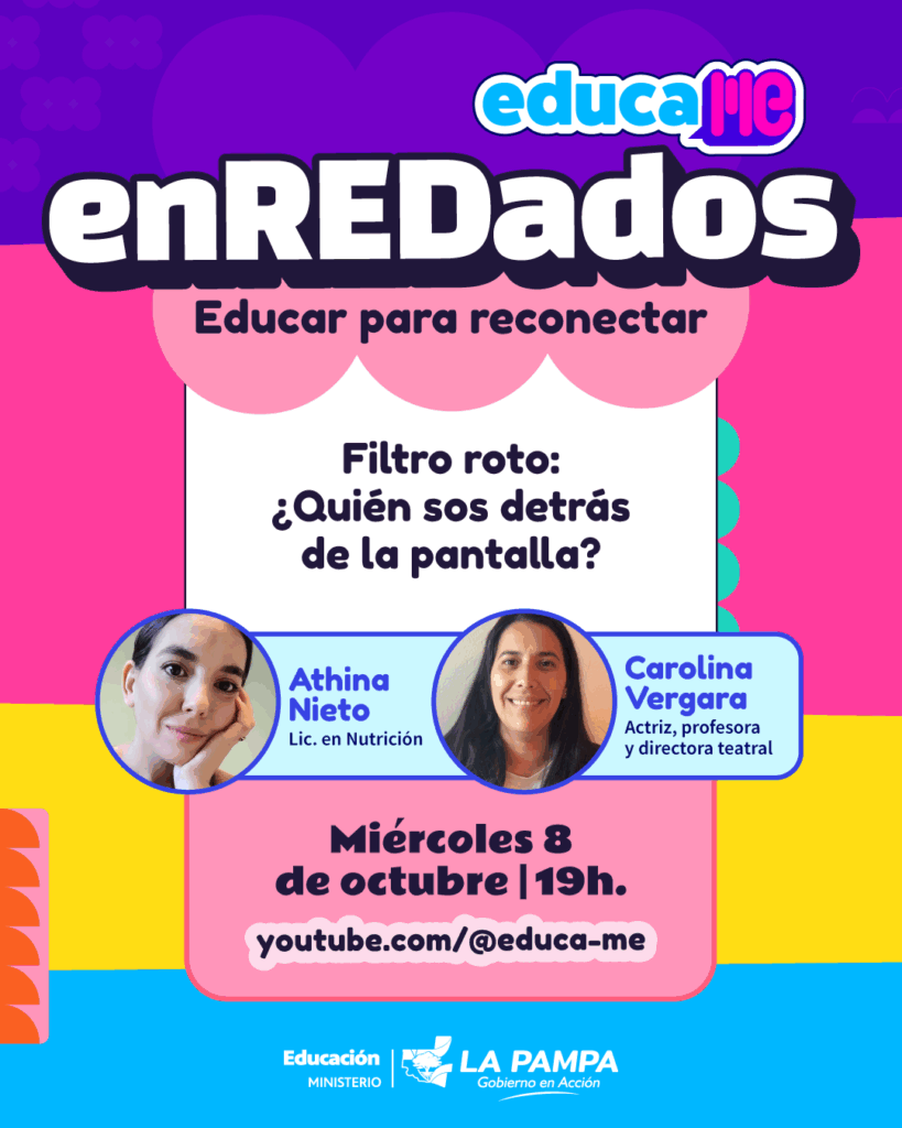 El Ministerio de Educación de La Pampa continúa con las transmisiones en vivo a través del canal en YouTube https://www.youtube.com/@educa-me. El próximo miércoles 8 de octubre a las 19, en el marco del ciclo “enREDados”, se compartirá el conversatorio “Filtro roto: ¿Quién sos detrás de la pantalla?”. Athina Nieto (Licenciada en Nutrición) y Carolina Vergara (Actriz, Profesora y Directora Teatral) visitarán el estudio de “educa-me” para dialogar acerca de cómo las redes sociales y las publicidades instalan modelos de cuerpos hegemónicos y una idea de perfección constante, y cómo eso repercute en la vida cotidiana: la alimentación, la salud mental, la autoestima y los vínculos, especialmente durante la adolescencia.