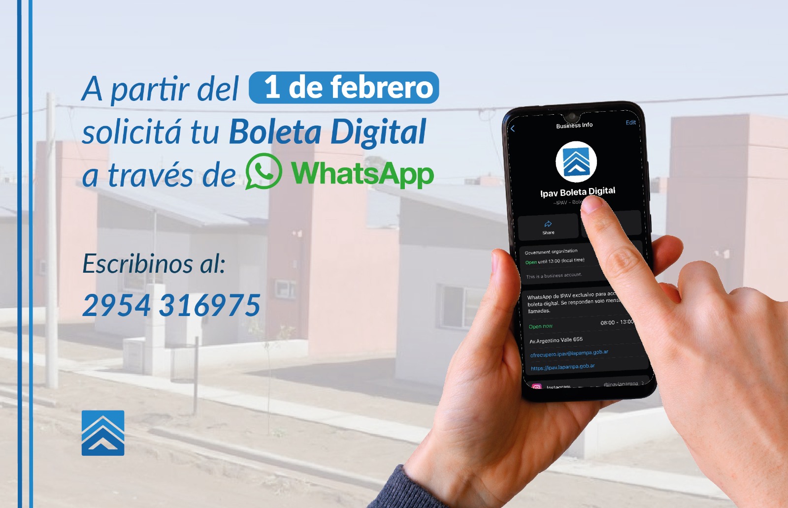 A partir del 1° de febrero, el Instituto Provincial Autárquico de la Vivienda pone a disposición de los adjudicatarios y adjudicatarias, la posibilidad de solicitar el envío de la boleta mensual a través de un número de aplicación whatsapp habilitado para tal fin.