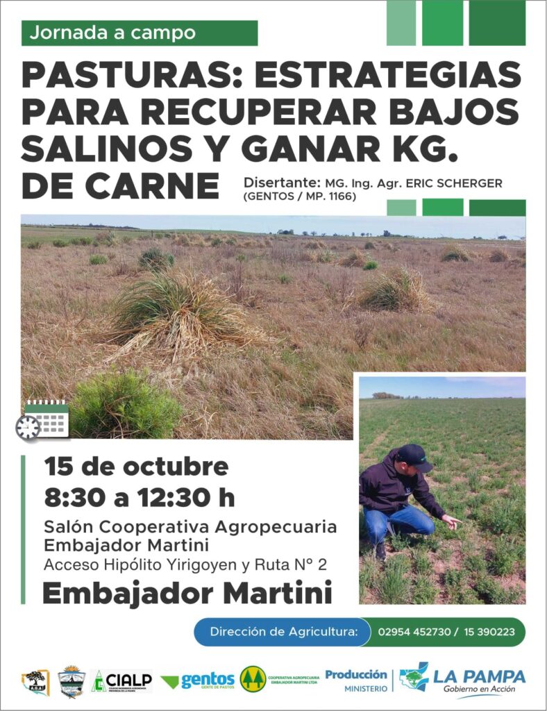 El Ministerio de la Producción invitó a participar de la Jornada a Campo “Pasturas: estrategias para recuperar bajos salinos y ganar kilos de carne”, que se realizará el miércoles 15 de octubre, de 8:30 a 12:30, en el Salón de la Cooperativa Agropecuaria de Embajador Martini ubicado en la calle Hipólito Yrigoyen y Ruta 2.