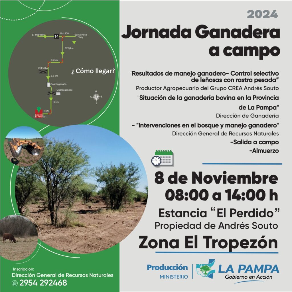 El encuentro comenzará con la disertación “Resultados de manejo ganadero – Control selectivo de leñosas con rastra pesada”, a cargo del productor agropecuario del grupo CREA, Andrés Souto. Seguidamente desde la Dirección de Ganadería se referirán a la “Situación de la ganadería bovina en la Provincia de La Pampa”. Finalmente, de la Dirección General de Recursos Naturales disertarán sobre las “Intervenciones en el bosque y manejo ganadero”. Luego se realizará la recorrida a campo para evaluar las intervenciones que se están realizando en dicho establecimiento.