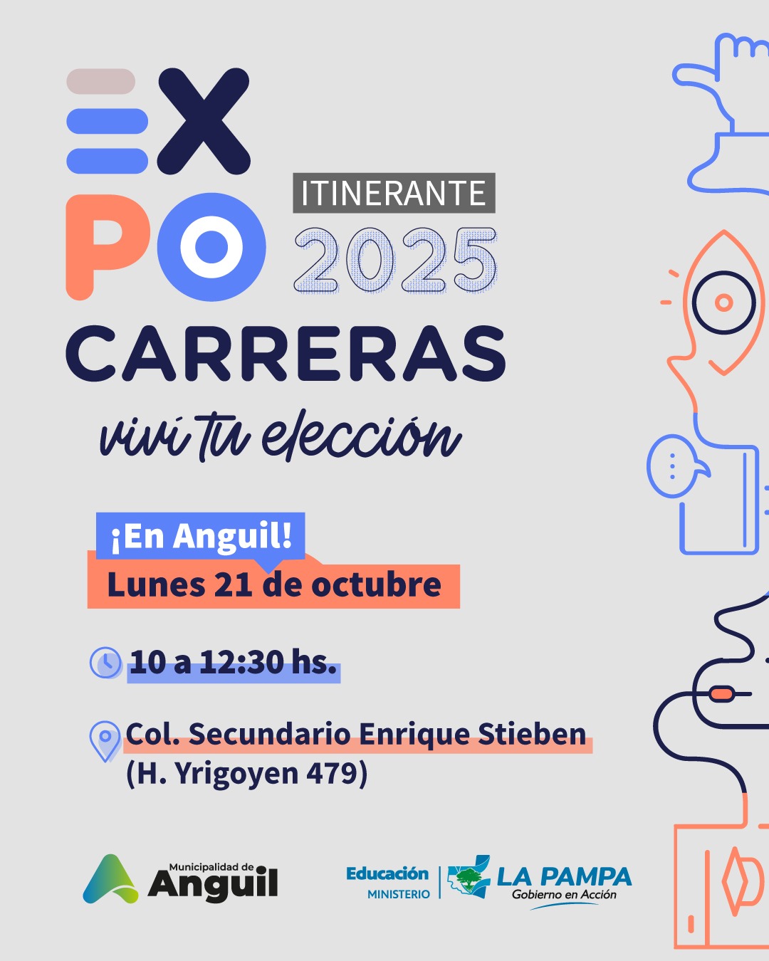 Se llevará a cabo el lunes 21 de octubre en el Colegio Enrique Stieben (Hipólito Yrigoyen N° 479) de Anguil. A través de la Expo Carreras Itinerante 2025, el Ministerio de Educación de La Pampa recorre distintas localidades pampeanas con el objetivo de acercar las ofertas educativas jurisdiccionales del nivel Superior.