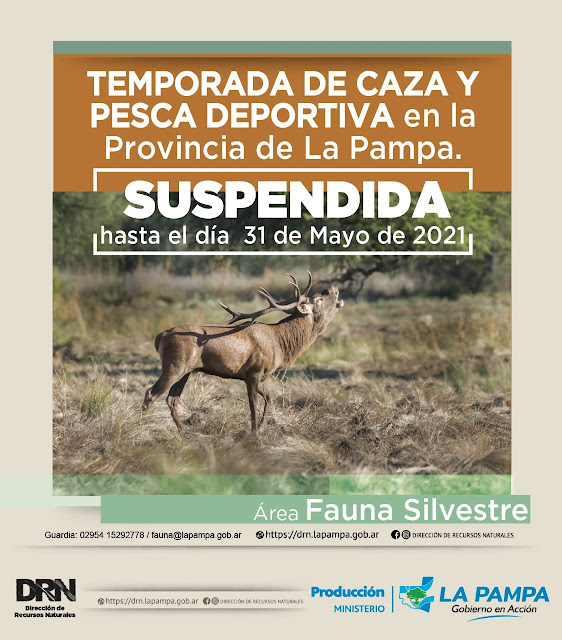 La Dirección de Recursos Naturales, dependiente de la Subsecretaría de Asuntos Agrarios del Ministerio de la Producción, informa que hasta el 31 de mayo del corriente año se encuentra suspendida la Temporada de Caza y Pesca Deportiva.