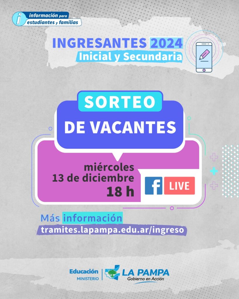 Próximamente se publicará en https://tramites.lapampa.edu.ar/ingreso/ las instituciones que formarán parte del sorteo, número de inscriptos/as y de vacantes.