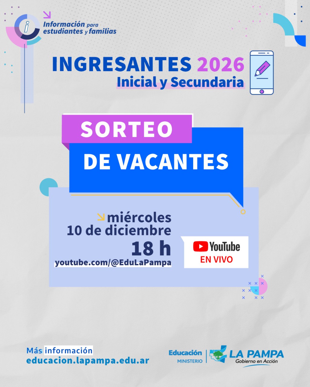 El miércoles 10 de diciembre a las 18 se realizará la transmisión del sorteo de vacantes en vivo a través del canal en YouTube del Ministerio de Educación de La Pampa: http://youtube.com/@EduLaPampa , el cual será fiscalizado por escribano público.