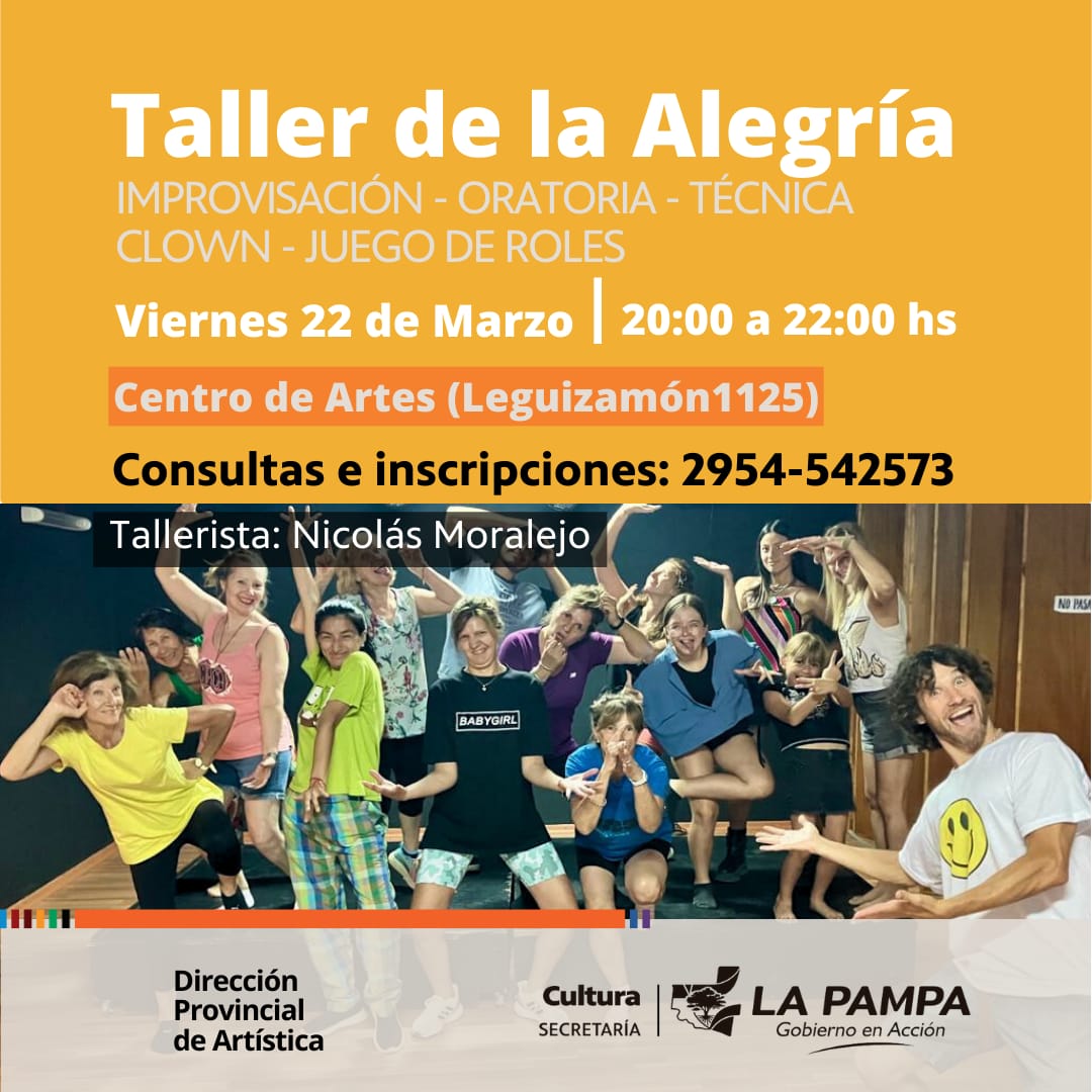 La Dirección Provincial de Artística de la Secretaría de Cultura llamó a participar del taller de la Alegría «Desestructurando el Yo», que se desarrollará este viernes 22 de marzo de 20 a 22, en el Centro de Artes, Leguizamón 1125, Santa Rosa.