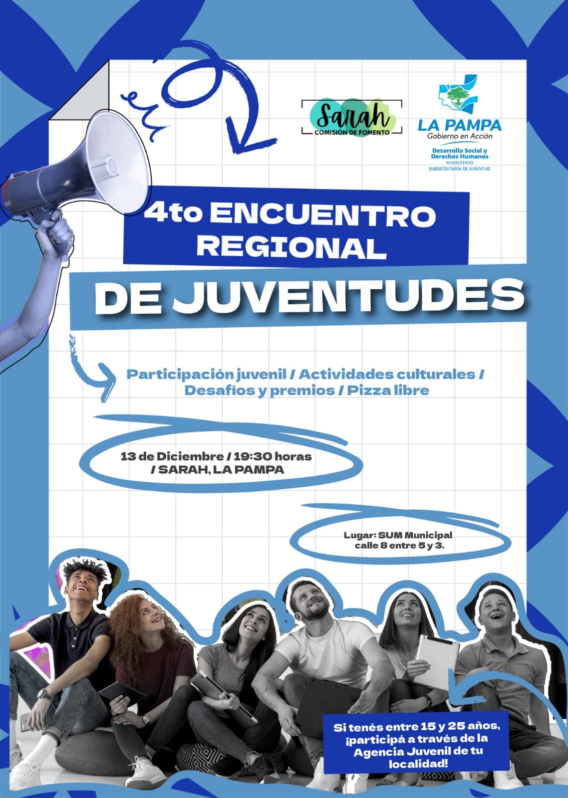 La Comisión de Fomento de Sarah será la sede del 4to Encuentro Regional de Juventudes, el próximo 13 de diciembre. La actividad está organizada por la Subsecretaría de Juventud del Ministerio de Desarrollo Social del Gobierno de La Pampa y la Comisión de Fomento de Sarah. El encuentro iniciará a las 19:30, en el SUM de la localidad anfitriona.