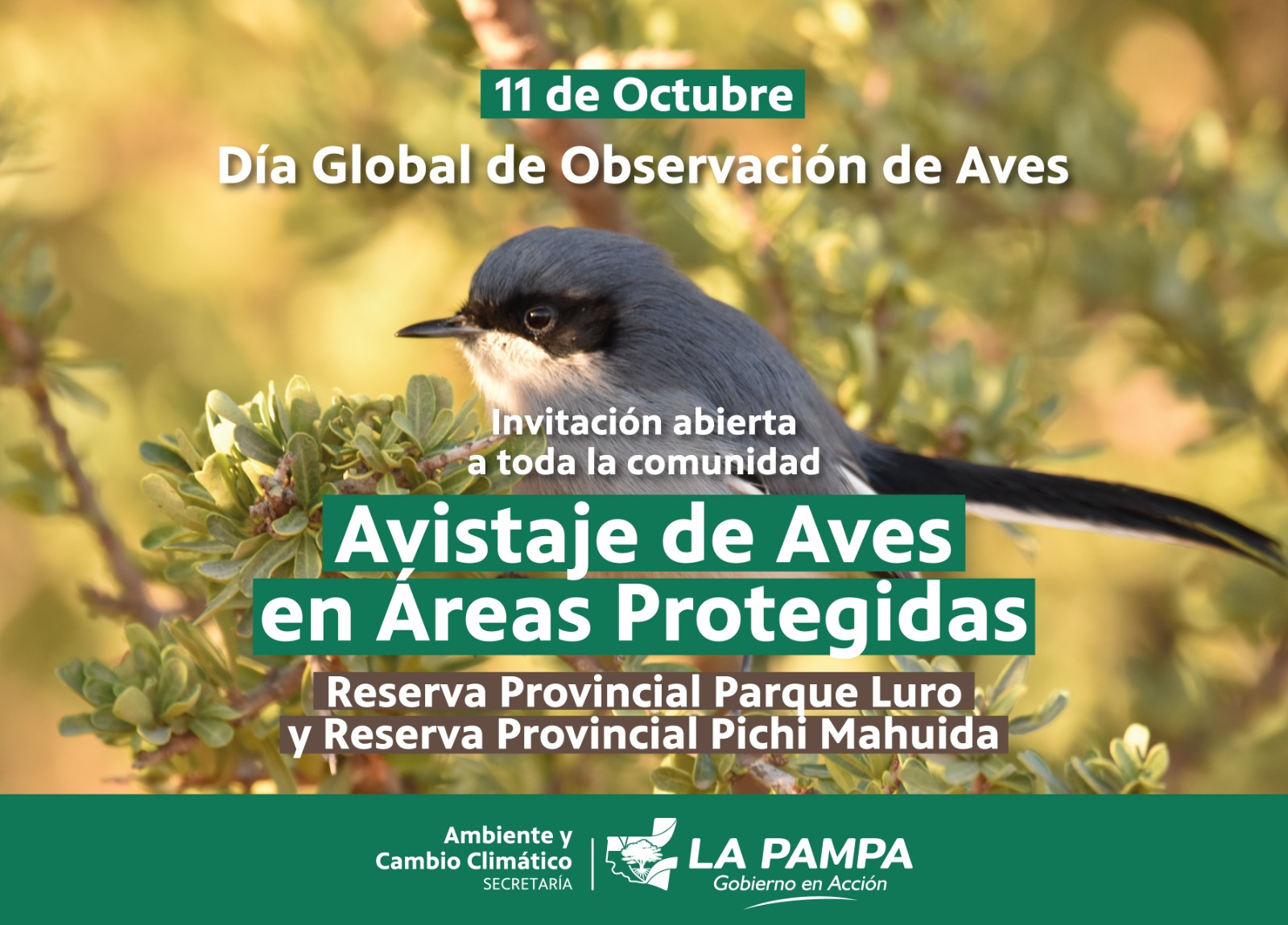 En el marco del “Día Global de la Observación de Aves”, este sábado 11 de octubre se llevará a cabo una actividad especial de avistaje de aves en dos de las Áreas Protegidas Provinciales más emblemáticas: Reserva Parque Luro y Reserva Pichi Mahuida.